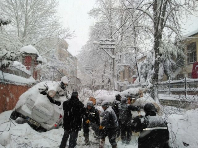 Bursa'da kar yağışı birçok yolu kapatırken, kardan devrilen ağaç iki aracın hasar görmesine yol açtı.Bursa'da son yılların en yoğun kar yağışı ile birlikte kar kalınlığı 1 metreye ulaştı. Şehir merkezinde belediye ekiplerinin çalışmalarıyla ana arterlerde sıkıntı yaşanmazken, mahalle ve sokak aralarında ise ulaşım zorlukla sağlandı. Araçlar sokak aralarında ilerlemekte güçlük çekerken, vatandaşlar da sokakta yürümekte zorlandı. Bursa Anadolu Erkek Lisesi kapısındaki ağaç ise park halindeki iki aracın üzerine devrildi. Cadde kısa süreliğine ulaşıma kapanırken, belediye ekipleri yaptığı çalışmayla ağacı parçalayarak araçların üzerinden kaldırdı. Araçlar kullanılmaz hale gelirken, sahipleri ise gözlerine inanamadı.(Zafer Peker / İHA)
