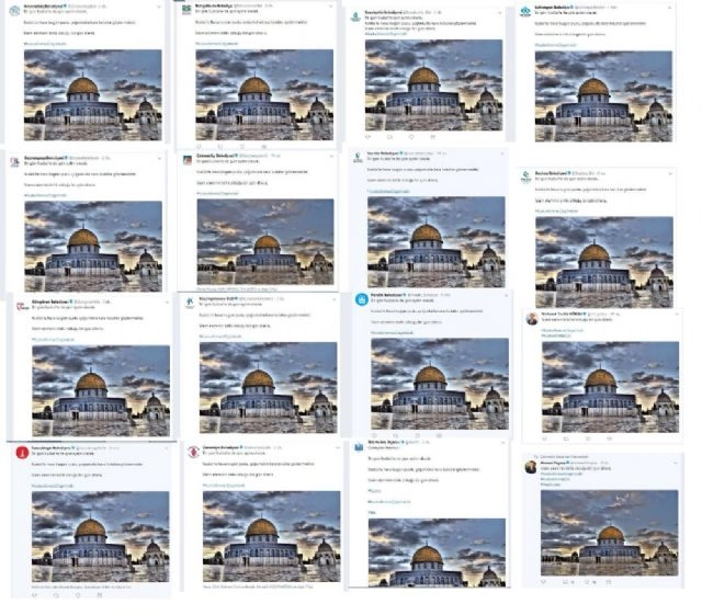 İstanbul'un AK Partili ilçe belediyeleri, ABD'nin Kudüs'ü İsrail'in başkenti olarak tanımasına sosyal medyada ortak tepki gösterdi.ABD Başkanı Donald Trump'un Kudüs'ü İsrail'in başkenti olarak tanıyacağını açıklamasının ardından gerçekleştirilen protesto ve tepkilere bir destek de İstanbul ilçe belediyelerinin sosyal medya hesaplarından geldi. AK Partili İstanbul BB ve ilçe belediyeleri bugün saat 09.00'da aynı anda günaydın mesajlarında Kudüs'ün simgelerinden Kubbettü's Sahra'nın fotoğrafı ve altına"Bir gün Kudüs'te de gün aydın olacak. Kudüs'te hava bugün puslu, çoğunlukla kara bulutlar gözlenmekte! İslam âleminin birlik olduğu bir gün dileriz" mesajı ile birlikte Cumhurbaşkanı Recep Tayyip Erdoğan'ın "#KudüsKırmızıCizgimizdir" sözlerini de etiket olarak paylaştılar.İBB Halkla İlişkiler, Arnavutköy, Bahçelievler, Başakşehir, Bayrampaşa, Beykoz, Çekmeköy, Esenler, Güngören, Kağıthane, Küçükçekmece, Pendik, Sancaktepe, Sultangazi, Şile, Ümraniye belediyeleri ve bazı belediye başkanları da bu organizasyona destek verdi. İstanbul dışından da bazı il ve ilçe beledilerinin de kampanyaya katılım sağladığı görüldü.