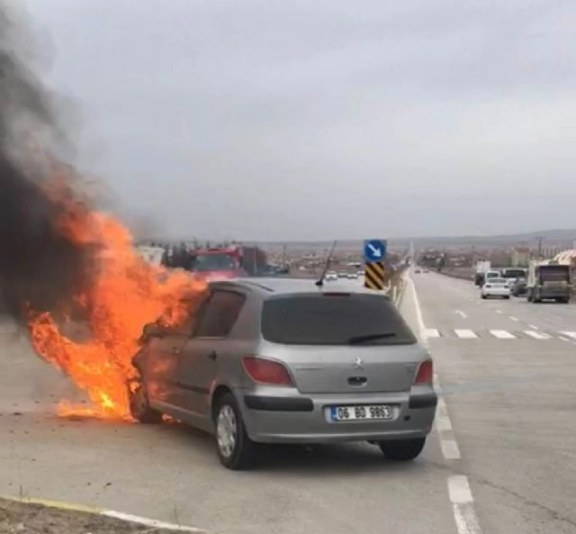 Konya'nın Kulu ilçesinde seyir halindeki otomobil motor kısmında çıkan yangın sonrası alev alev yandı. Edinilen bilgiye göre, Mustafa Küçükerdoğan idaresindeki 06 BD 9863 plakalı otomobil, seyir halindeyken motor kısmından duman yükselmeye başladı. Otomobilini Selçuk Üniversitesi Meslek Yüksekokulu Kavşağında durduran sürücü Mustafa Küçükerdoğan, alev alan motor kısmını söndürmeye çalıştı. Sürücünün müdahalesinin yetersiz kalması üzerine çevredeki vatandaşlar tarafından itfaiyeye haber verildi. Olay yerine sevk edilen itfaiye ekipleri, alev alev yanan otomobili yaptığı soğutma çalışmasının ardından söndürdü. Yangın sonrası otomobilde büyük çapta hasar meydana geldi. Otomobilin alev alev yanması çevredeki bir vatandaşın cep telefonuyla görüntülendi. Yangın nedeniyle bir süreliğine kapatılan Konya-Ankara karayolu aracın söndürülmesinin ardından tekrar trafiğe açıldı.(Ömer Keleş /İHA)
