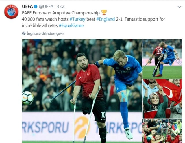 Avrupa Şampiyonası finalinde İngiltere'yi 2-1 yenerek kupaya uzanan Ampute Milli Takımı'nın bu başarısı, dünyanın önde gelen medya organlarında da geniş yer buldu. Türkiye'nin ev sahibi olduğu Avrupa Şampiyonası'nda dün akşam Vodafone Park'ta 40 bin kişinin oynanan maçta İngiltere'yi 2-1 mağlup ederek şampiyon olarak büyük bir başarıya imza atan Ampute Milli Takımı, uluslararası basında da yankı uyandırdı.UEFA: "İNANILMAZ SPORCULARA OLAĞANÜSTÜ DESTEK"Karşılaşmanın ardından sosyal medya hesabından Ampute Futbol Takımı'nın fotoğrafını paylaşarak bir mesaj yayımlayan UEFA, "Ev sahibi Türkiye'nin İngiltere'yi yendiği maçı 40 bin taraftar izledi. İnanılmaz sporculara olağanüstü destek" ifadelerine yer verdi.BLEACHER REPORT: "AVRUPA AMPUTE ŞAMPİYONLUĞU'NU KAZANMAK BÖYLE HİSSETTİRİR"ABD'li spor sitesi Bleacher Report ise millilerin sevinç fotoğraflarını paylaşarak, 'Avrupa Ampute Şampiyonluğu'nu kazanmak böyle hissettirir' notunu düştüğü paylaşımını kalp ve Türk bayrağı ise süsledi.ESPN: "SPORU BU YÜZDEN SEVİYORUZ"Uluslararası düzeyde önde gelen medya organlarından olan ESPN, şampiyonluk coşkusu yaşayan ay-yıldızlı sporcuların fotoğrafını sosyal medya hesabından paylaşarak, "Türkiye, uzatma dakikalarında attığı golle şampiyon oldu. Sporu bu yüzden seviyoruz" açıklamasını yaptı.