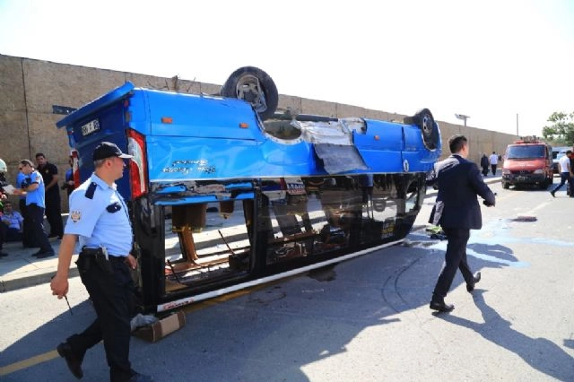 Ankara'da bir dolmuş ile otomobilin çarpışması sonucu 16 kişi yaralandı. Alınan bilgiye göre, Hipodrum Caddesi'nden Yenimahalle istikametine giden 01 BRB 56 plakalı otomobil kontrolden çıkarak önce kaldırıma çarptı ardından da karşı şeride geçererek Sinsan-Ulus hattında çalışan 06 J 1894 plakalı dolmuşa çarptı. Çarpmanın etkisiyle dolmuş devrildi. Kazada ilk belirlemelere göre 16 kişi yaralandı. Yaralılar olay yerine gelen ambulanslarla Ankara'daki değişik hastanelere kaldırıldı. (İlkerturak - Burak Altun - Abdullah Sarıca - Ömer Çetin/İHA)