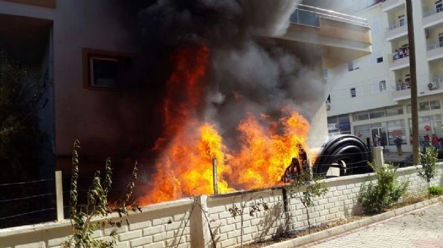 Antalya'nın Gazipaşa ilçesinde, zirai malzemelerin satıldığı bir iş yerinin altında bulunan sulama boruları sabah saatlerinde henüz bilinmeyen bir sebeple alev aldı. Kısa sürede büyüyen alevler iki apartmanı dumana boğarken, apartman sakinleri kendilerini sokağa attı. Gazipaşa ilçesinde zirai malzemelerin satıldığı bir iş yerinde sabah saatlerinde yangın çıktı. Kısa sürede yoğun duman oluşturan alevlerin, bazı apartmanların panjurlarına sıçradığı belirtildi. Apartman sakinlerinden Fatma Yıldız, pencerelerinin açık olması halinde alevlerin evine gireceğini söyledi. Yangını ilk fark edenlerden Ufuk Gömeç ise yangında yan tarafı yanan bir otomobili alandan uzaklaştırarak bir faciayı önledi. Depoları benzin ve LPG ile dolu olan aracın depo kapağı yanmasına rağmen patlamaması herkese derin bir nefes aldırdı.Yangını balkondan gören ve itfaiyeyi arayan Murat Yalçın ise yangının kısa bir sürede büyüdüğünü ve balkonlara doğru yükseldiğini söyledi. Yangında otomobili hasar gören İhsan Meydan, otomobilinin yakıt dolu olduğunu ve patlamamasının büyük bir şans olduğunu belirtti.Antalya Büyükşehir Belediyesi İtfaiye Daire Başkanlığına bağlı 4 ekibin müdahale ettiği yangın kısa sürede söndürüldü. İtfaiye ekipleri yangının çıkış nedenini araştırıyor.(Ahmet Mervan Taş/İHA)