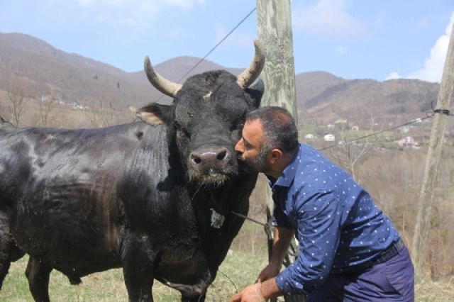 Artvin'de yaşayan Ulaş Gülseçkin ile 'Tayfun' ismini verdiği boğası arasındaki sevgi bağı görenleri hayrete düşürüyor.