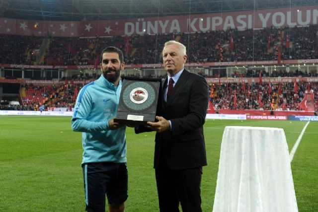 Milli futbolcu Arda Turan'a, Türkiye ile İzlanda arasında oynanacak müsabaka öncesinde 100. milli maçı dolayısıyla plaket takdim edildi.