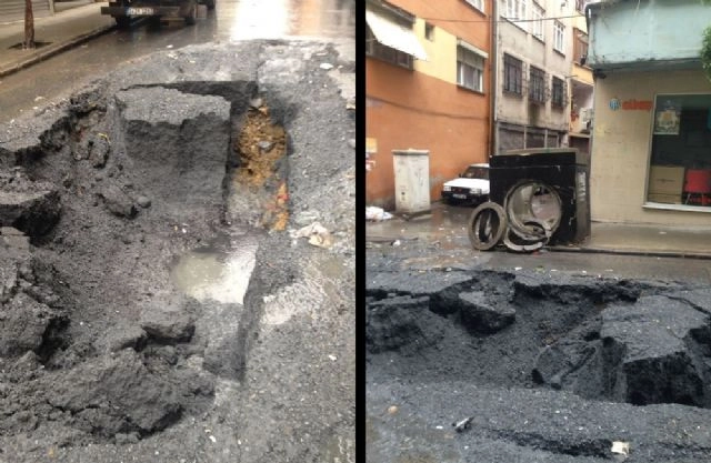 İstanbul Beyoğlu'nda gece saatlerinde yağan yağmur sonrası asfalt çökerken caddede park halinde bulunan araçlar son anda kurtarıldı. Asfaltın çökme anı ise saniye saniye kameralara yansıdı.Beyoğlu'nda önceki gece saatlerinde yağan şiddetli yağmur sebebiyle Üstbaruthane Caddesi'nde asfalt çökmesi meydana geldi. Asfaltın çökmesini fark eden vatandaşlar park halinde bulunan araçların sahiplerine ulaşarak araçlarının tehlikede olduğunu çekmelerini söyledi. Bunun üzerine araç sahipleri çökmenin yaşandığı yere gelerek araçlarını bulundukları yerlerden kaldırarak güvenli bir yere park etti. Göçük anı ise güvenlik kameralarına saniye saniye yansıdı.Kameralara yansıyan görüntülerde, şiddetli yağmura dayanamayan asfaltta göçük olduğu görülüyor. Oluşan göçük bir anda büyüyerek caddede bulunan arabaları tehlikeye atıyor.Araç sahiplerinden Mustafa Kılıç,' Kamyonetim burada duruyordu, tam göçmek üzereyken haber verdiler, bende aracı bulunduğu yerden aldım. Kurtardım, Allah'a şükür bir şey olmadı. Burada bir çalışma yapmışlardı, kapattılar sanırım dolgu malzemesini alttan yağmur götürdü. Haberimiz olmasaydı aracımız düşmüştü. Sağ olsun komşular haber verdi. Biraz daha geç kalsaydım araba düşecekti' ifadelerini kullandı.