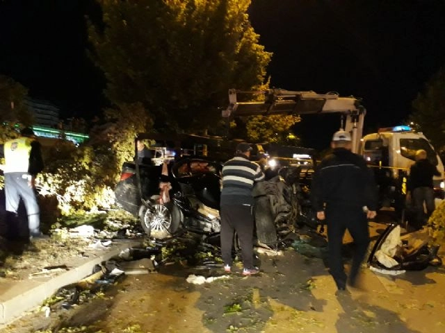 Ankara'da aşırı hızlı olduğu iddia edilen otomobilin kontrolden çıkıp taklalar atarak ağaçlara çarpması sonucu 2 kişi hayatını kaybetti, 1 kişi yaralandı. Kaza, saat 01.00 sıralarında Yenimahalle'de meydana geldi. Edinilen bilgilere göre; Halil Sezai Erkut Caddesi üzerinde Etlik istikametinde seyreden 06 DM 4468 plakalı otomobil, sürücüsü Erdoğan Ergüler'in (28) direksiyon hakimiyetini kaybetmesi sonucu hızla kayarak refüje çarptı. Hızını alamayan otomobil taklalar atarak refüj üzerindeki ağaçlara çarptı. Bir ağacı devirdikten sonra yan dönerek duran otomobildeki 3 kişi sıkıştı. Hurda yığınına dönen aracın motoru kazanın etkisiyle metrelerce uzağa fırladı.Kaza yerinden yükselen toz bulutunu gören vatandaşlar, aracın yanına gelerek yaralılara yardım etmeye çalıştı. Vatandaşların ihbarı üzerine kaza yerine çok sayıda polis, itfaiye ve sağlık ekibi sevk edildi. Hızla yaralıların yardımına koşan sağlık ekipleri, yolculardan Gökhan Elma'nın (28) araç içinde hayatını kaybettiğini tespit etti. İtfaiye, polis, 122 acil servis ekipleri ve vatandaşlar, sıkıştıkları yerde yardım çığlıkları atan yaralıları kurtarmak için seferber oldu. Şoför mahallinde sıkışan Erdoğan Ergüler, aracın içinden ağır yaralı olarak çıkarıldı. Ambulansla tedavi edilmek üzere en yakın hastaneye götürülen Ergüler'in yolda hayatını kaybettiği öğrenildi.İtfaiye ekipleri, otomobilin arka koltuğunda oturan Nuran Yıldırım'ı kurtarmak için çalışmalarını sürdürdü. Hurda yığınına dönen otomobil, devrilme tehlikesine karşı halatla çekiciye bağlandı. Sağlık ekipleri, kurtarma çalışmaları sırasında yardım çığlıkları atan Yıldırım'ı sakinleştirmek için telkinlerde bulundu. İtfaiye ekiplerinin yaklaşık 1 buçuk saatlik çalışmasının ardından kurtarılan yaralı, ambulansla Gülhane Eğitim ve Araştırma Hastanesi'ne götürülerek tedavi altına alındı. Kazayı haber alarak gelen şahısların yakınları, sinir krizleri geçirdi. Sağlık ekipleri, cenaze yakınlarını ambulansa alarak sakinleştirdi. Araçta sıkışarak hayatını kaybeden Gökhan Elma'nın cansız bedeni 2 saat süren çalışmaların ardından çıkarıldı.Kazanın görgü tanığı Melih Kültür, "Yürüyüş yolunda koşu yapıyordum, araç aşırı süratli geldi, yanımdan geçtikten sonra kaymaya başladı. Kaymasıyla ağaca girmesi bir oldu" şeklinde konuştu.Kazanın meydana geldiği cadde yaklaşık 3 saat çift taraflı olarak trafiğe kapatıldı. Aşırı hızlı olduğu iddia edilen otomobilin içinden çıkan alkollü içki şişeleri ise dikkat çekti.(Caner Ünver/İHA)