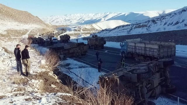 Van'dan Hakkari'ye gitmekte olan 60 araçlık askeri konvoyda meydana gelen kazada çok sayıda asker yaralandı.Van'dan Hakkari'nin Yüksekova ilçesine gitmekte olan 'Kirpi' adı verilen zırhlı araçlardan oluşan 60 araçlık konvoyda, Van-Hakkari karayolu üzerindeki Zernek Barajı yakınlarında gizli buzlanmadan dolayı kaza meydana geldi. Kazada 3 araç devrilirken, ilk belirlemelere göre 15 asker yaralandı. Ambulanslarla Van Bölge Eğitim ve Araştırma Hastanesine kaldırılan askerlerin sağlık durumlarının iyi olduğu öğrenildi.