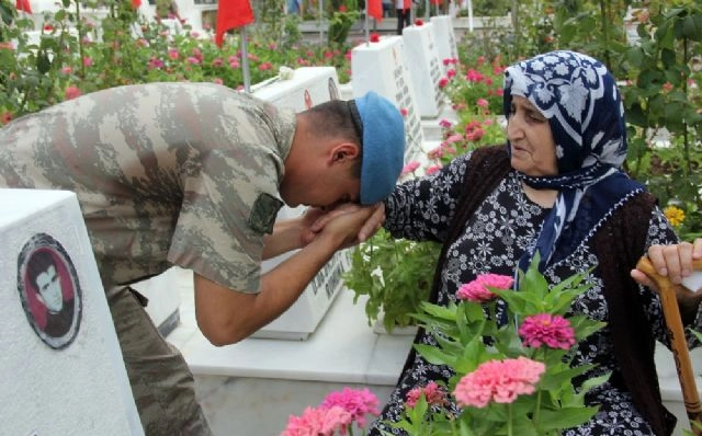 Adana'da, 21 yıl önce şehit olan oğlunun kabrini ziyaret eden şehit annesinin elini öpen Uzman Çavuş Feridun Balkan, 'Bu annenin eli öpülmez mi, bu anneyi insan sırtında taşır' dedi.