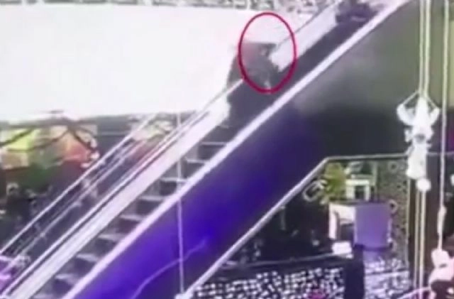 Anne kucağındaki bebek yürüyen merdivenlerden böyle düştü.