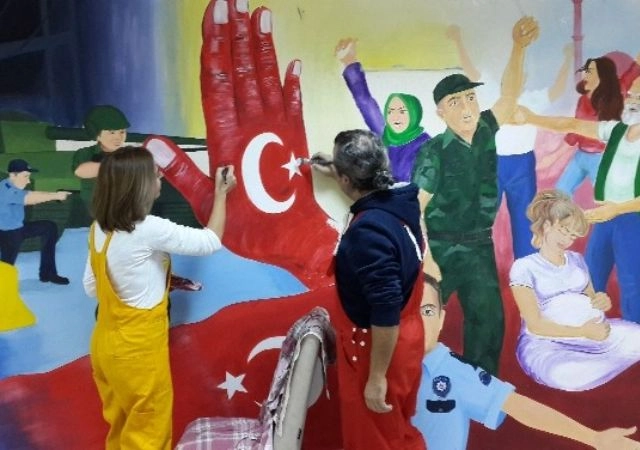 Aydın Valiliği İl Emniyet Müdürlüğü tarafından tadilatı sürdürülen Polisevi'nin duvarlarına '15 Temmuz Milli İrade Destanı' işlendi. Resim öğretmenleri Emine-Gültekin Rüzgar Çifti tarafından hummalı çalışmalar sonrası 'Milli İrade Destanı'nın duvarlara işlenen resimleri görenleri duygulandırıyor.
