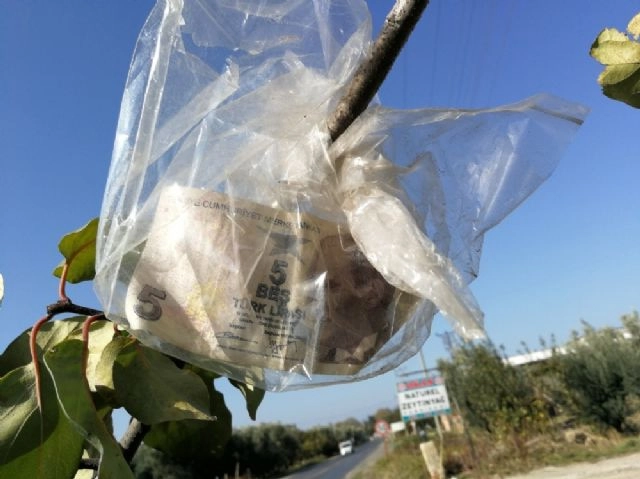 Bursa'nın İznik ilçesinde, canı meyve çeken bir vatandaş, yol kenarındaki ağaçtan ayva koparıp yedi, dala ise 5 lira astı. Para polisler tarafından bulundu.