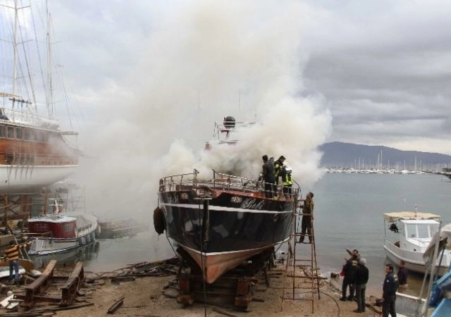 Muğla'nın Fethiye İlçesi'nde bakıma için bekleyen 20 metre uzunluğundaki 'Bebi' isimli motor yatta yangın çıktı.