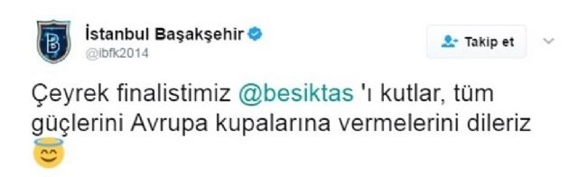 Medipol Başakşehir, ligde şampiyonluk yarışı verdiği Beşiktaş'ı tebrik ederken esprili bir göndermede bulundu. UEFA Avrupa Ligi'nde Olympiakos'u 4-1 mağlup eden Beşiktaş çeyrek finale kaldı. Karşılaşma sonrası siyah-beyazlı takıma tebrik mesajları yağarken, bir tebrik de ligde siyah-beyazlıların 2 puan gerisindeki Medipol Başakşehir'den geldi. Kulübün sosyal medya hesabından paylaşılan mesajda, "Çeyrek finalistimiz Beşiktaş'ı kutlar, tüm güçlerini Avrupa kupalarına vermelerini dileriz" ifadelerine yer verildi.