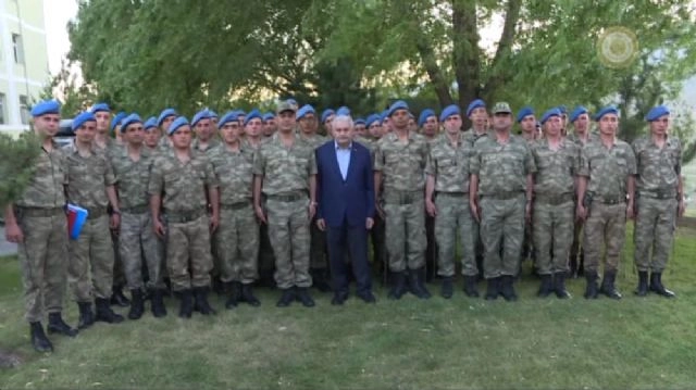 Başbakan Yıldırım, memleketi Erzincan'da Kemah İlçe Jandarma Komutanlığını ziyaret etti. Burada konuşan Yıldırım, "Terörle mücadelede geldiğimiz en önemli nokta budur. Savunma değil, taarruz" dedi. Ramazan Bayramının ilk gününü memleketi Erzincan'da geçiren Başbakan Binali Yıldırım, Kemah İlçe Jandarma Komutanlığını ziyaret etti. Askerlerin bayramını kutlayan Yıldırım, milletin kendilerine minnettar olduğunu belirtti ve Mehmetçiğe teşekkür etti. Terörle mücadelede kararlılık vurgusu yapan Başbakan, "Terörist saldıran değil, sizden kaçan, saklanan konuma geldi. Terörle mücadelede geldiğimiz en önemli nokta budur. Savunma değil, taarruz. Geçen yıl 6 Ağustos'ta aldığımız bu karar, bugüne kadar sahada mutlak üstünlüğü ele geçirmemizi sağladı. Bundan sonra da buna devam edeceğiz" dedi.Başbakan Yıldırım, daha sonra, Kemah ilçesi kırsalında 4 teröristi etkisiz hale getiren komando bölüğüyle hatıra fotoğrafı çektirdi.