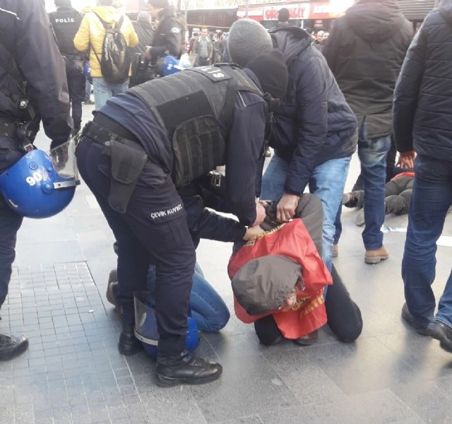 Başkent'te izinsiz broşür dağıtan bir gruba polis müdahale etti. Yaşanan arbede sonrası 10 eylemci gözaltına alındı. Kızılay Karanfil Sokak'ta toplanan bir grup, referandum ile ilgili izinsiz broşür dağıttı. Polis ekipleri grupları broşür dağıtmayı durdurmaları konusunda uyardı. Grubun uyarılara uymaması üzerine polis ekipleri müdahale etti. Yaşanan müdahale sırasında çıkan arbedede 10 eylemci gözaltına alınarak Çankaya İlçe Emniyet Müdürlüğü'ne götürüldü.(Uğur Kan Yüksek - Mustafa Apaydın/İHA)