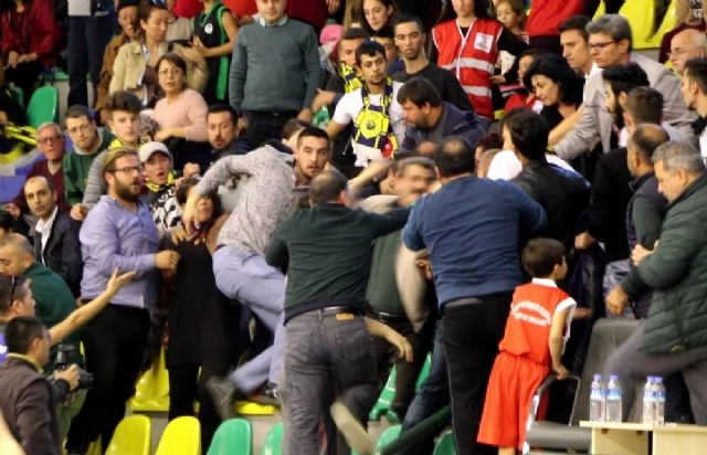 Türkiye Kadınlar Basketbol 1. Lig takımlarından Edremit Belediyesi Gürespor Takımı, Mersin Basketbol Takımı'nı konuk ederken, taraftarlar arasında çıkan yumruklu kavgada 2 kişi yaralandı ve 2 kişi de göz altına alındı.