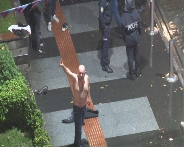 Trabzon'da şehrin meydanında yağmurla havada soyunan şahıs, kendisini gözaltına almaya çalışan polis ekiplerine zor anlar yaşattı. Akşam saatlerinde Atatürk Alanı Meydan Parkı yanındaki yol kenarındaki dubaları tekmeleyen şahsa polis ekipleri uyarılarda bulundu. Bu sırada alkollü olduğu öğrenilen şahıs, polislere tepki göstererek yağan yağmura aldırmadan bağırarak üzerindekileri çıkarmaya başladı. Şahsı durdurmakta güçlük çeken ekipler takviye ekip isterken, olay yerine takviye olarak gelen polis ekipleri şahsı gözaltına almak için büyük uğraş verdi. Yaklaşık 10 kişilik çevik kuvvet ekibi, şahsı sakinleştirmek ve polis aracına bindirmek için yoğun çaba sarf ederken, alkollü şahıs bir türlü araca binmek istemedi. "Burada kamera var mı? çeksene beni. Az dur kamera çeksin beni" diyen alkollü şahıs, polis ekipleri tarafından gözaltına alındı.