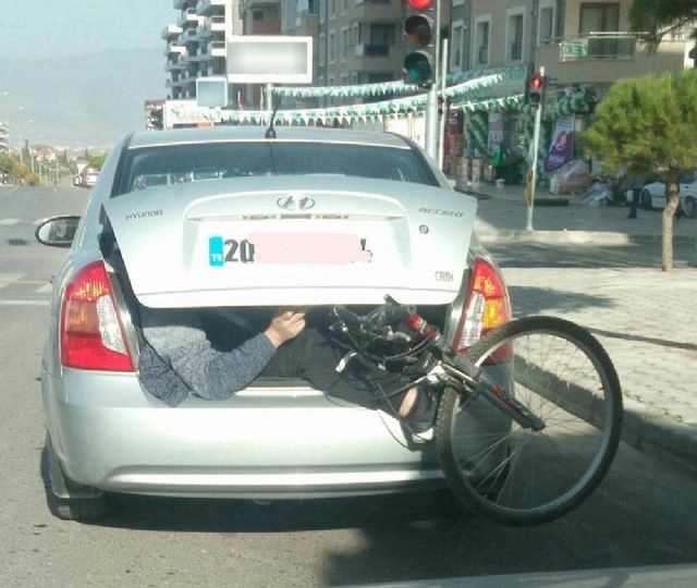 Denizli'nin Merkezefendi ilçesinde, bir vatandaşın bisiklet ile birlikte otomobilin bagajına binmesi görenleri hayrete düşürdü. Otomobilin fotoğrafını çeken vatandaşlar, sosyal medyada paylaşarak şaşkınlıklarını gizleyemedi.