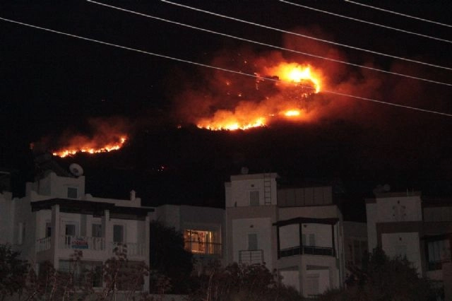 Bodrum'a bağlı Turgutreis Mahallesi'nde otluk ve makilik alanda çıkan yangın, 4 saatte 50 hektarlık alanı küle çevirdi, Turgutreis Mahallesi Akyarlar mevkiinde otluk ve makilik alanda akşam saatlerinde yangın çıktı. Kısa sürede rüzgarın da etkisiyle hızla büyüyen yangına 50 orman işçisi, 10 arazöz, Muğla Büyükşehir Belediyesi İtfaiye Daire Başkanlığı Bodrum Grup Amirliği ekipleri ve Bodrum Akut ekibi müdahale etti. Tepenin yamacında büyüyen yangının, evlere 100 metre kadar yaklaştığı görüldü. Yerleşim bölgelerine tedbir amaçlı sağlık ekipleri sevk edilirken bölgede yaşayan vatandaşların tedirgin olduğu gözlendi.Bölgeye gelerek incelemelerde bulunan Muğla Orman Bölge Müdürü Mehmet Çelik yaklaşık 50 hektarlık alanın yandığını belirterek şu ifadelere yer verdi: "Akşam üstü başlayan yangına 10 arazöz ve orman işçisine müdahale ediyoruz. Yangının bir kısmı kontrol altına alındı. Bu bölgenin büyük bir kısmı kontrol altına alındı. Çalışmalarımız sürüyor" dedi.(Eren Ayhan/İHA)