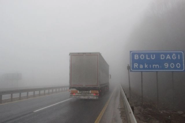 Türkiye'nin en önemli geçiş güzergahlarından olan Bolu Dağında yoğun sis nedeniyle görüş mesafesi yer yer 20 metreye kadar düşüyor.İstanbul Ankara arasında en önemli geçiş noktalarından Bolu Dağında sis etkili oluyor. Özellikle Seymenler, Karanlıkdere, Bakacak bölgelerinde etkili olan sis nedeniyle görüş mesafesi yer yer 20 metreye kadar düşüyor. Araç sürüleri trafikte ilerlemekte zorluk çekerken bazı sürücüler araçlarının dörtlü flaşörlerini yakarak ilerliyor. Yetkililer sürücülerin yavaş ve takip mesafesine uyarak ilerlemelerini yönünde uyarılarda bulundular.