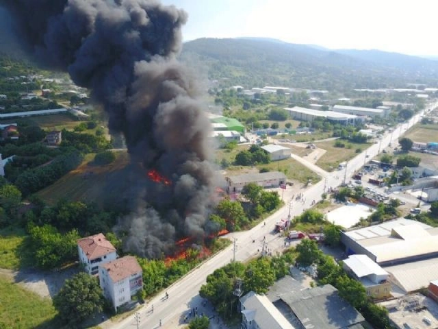 Bursa'da boya fabrikasında çıkan yangını söndürme çalışmaları sürüyor. Yangının boyutu ise havadan görüntülendi. Merkez Nilüfer ilçesi Yaylacık Mahallesi'ndeki fabrikada 16.41'de başlayan yangın, yanıcı maddelerin patlamasıyla daha da büyüdü. Bursa Büyükşehir İtfaiye ekipleri 9 dakika içinde ilk müdahaleyi yaptılar.İtfaiyenin yanısıra Buski, Nilüfer Belediyesi ve orman ekiplerinin de desteğiyle alevlere havadan ve karadan müdahale edildiAlevler saat 18.15 sıralarında kısmen kontrol altına alındı. Siyah dumanların ise hala gökyüzüne yükseldiği belirtildi. Yakındaki bir fabrikaya ziyarete giden AK Parti Bursa Milletvekilleri İsmail Aydın ve Zekeriya Birkan da olay yerine gelerek bilgi aldılar.Bir itfaiye işçisinin de hafif şekilde yaralandığı yangında, bazı boya maddeleri de etrafa saçıldı.İtfaiye ekipleri yangının çıkış sebebiyle ilgili araştırma başlattı. Söndürme çalışmaları esnasında fabrika işçileri arasında da zaman zaman gerginlikler yaşandı.(Uğur Uslubaş-Serkan Akkuş-Samet Doğru/İHA)