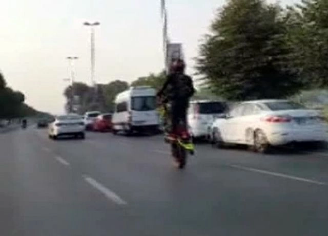 İstanbul'da motosikletiyle tek tekerlek üzerinde seyreden sürücü, hem kendi hem de diğer sürücülerin hayatını tehlikeye attı. Bu tehlikeli şov, başka bir sürücü tarafından saniye saniye görüntülendi. Kadıköy Bostancı sahil yolunda motosiklet sürücüsü yolda seyir halindeyken tek tekerlek üzerinde şov yaptı. Yaptığı şovla hem kendi hayatını hem de diğer sürücülerin hayatlarını tehlikeye atan motorcu, seyir halinde olan başka bir sürücü tarafından cep telefonu ile saniye saniye kaydedildi. Görüntülerde, motosiklet sürücüsünün tek tekerlek üzerinde ilerlediği ve bir süre sonra iki tekerlek üzerinde ilerlemeye başladığı görülüyor.