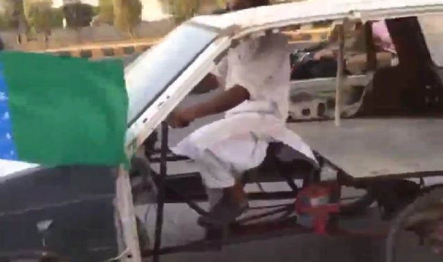 Otomobil gibi gözüküyor ama değil. O, üzerine otomobil iskeleti oturtulmuş bir bisiklet.Bu ilginç görüntü, Pakistan'da çekildi. Görenlerin ilk bakışta otomobil sandığı bu araçsa, aslında sadece bir bisiklet. Ama üzerine otomobil iskeleti oturtulmuş bir bisiklet.Tabii bu araçla yolculuk tehlikeli olsa da hakkını vermek gerek, pratik bir zeka ürünü.