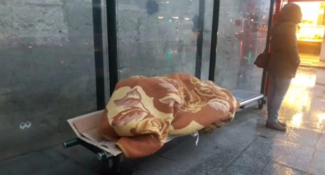 Soğuk ve yağışlı havanın etkili olduğu bu günlerde İstanbul Şişli'de otobüs durağında üzerine battaniye çekerek uyuyan adamın hali yürekleri sızlattı.