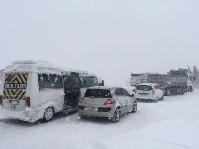 Bursa'da yoğun kar yağışı hayatı felç etti. Bursa-İzmir yolunda araçlar yolda kalırken, 20 kilometrelik araç kuyruğu oluştu. Dün gece başlayan yoğun kar yağışı Bursa'da hayatı olumsuz etkiledi. Bursa-İzmir yolu kar sebebiyle ulaşıma kapandı. Gölyazı'dan Mustafakemalpaşa'ya kadar İzmir yolunda yaklaşık 20 kilometrelik araç kuyruğu oluştu. Şehirlerarası kara yolu ulaşıma kapanırken, sürücüler araçlarında mahsur kaldı.Hava sıcaklığı eksi 6 dereceye düşerken, yer yer tipi şeklinde kar yağışı devam ediyor. Yol kapandığı için tuzlama ve kar küreme araçları da bölgeye intikal edemiyor. Yaklaşık 2 saattir araçlarında mahsur kalan sürücüler tedirgin bir şekilde kurtarılmayı bekliyor.(Uğur Uslubaş / İHA)
