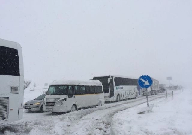 Bursa'da yoğun kar yağışı sebebiyle İzmir yolunda yüzlerce araç 4.5 saattir yolun açılmasını bekliyor.Dün gece başlayan yoğun kar yağışı sebebiyle Bursa-İzmir yolu ulaşıma kapandı. 2 otobüsün yoğun kar ve buzlanma sebebiyle yolun dışına çıkması sonucu uzun kuyrukların oluştuğu öğrenildi. Kurtarma ekipleri, Bursa tarafından konvoyun başına ulaşamıyor. Balıkesir ve Bandırma tarafından gelmeye çalışan kurtarma ekipleri ise, yolu açmak için seferber oldu. Yaklaşık 4.5 saattir yolda mahsur kalan sürücülerin bazıları ise benzinliklere sığındı. Bursa'dan İzmir yönüne araç salınmıyor. Şehirlerarası Otobüs Terminali'nden Balıkesir ve İzmir yönüne otobüslerin çıkışına izin verilmiyor. Konvoyun uzunluğunun 40 kilometreyi bulduğu öğrenildi.Bölgede yoğun kar yağışı etkili olmaya devam ediyor.