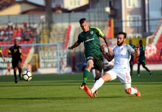 Bursaspor, yeni sezon hazırlıkları kapsamında deplasmanda karşılaştığı TFF 1. Lig ekibi Balıkesirpor'a 2-1 mağlup oldu. Afyonkarahisar'daki sezon öncesi hazırlıklarını tamamlayan TFF 1. Lig ekiplerinden Balıkesirspor Baltok, yeni sezon hazırlıkları kapsamında 3. etap kamp çalışmalarını sürdüren Bursaspor ile sezon açılış maçında karşı karşıya geldi. Balıkesir Atatürk Stadı'nda saat 19.00'da başlayan karşılaşmada ev sahibi Balıkesirspor, sahadan 2-1 galip ayrıldı.Karşılaşmanın henüz 5. dakikasında sol kanattan gelişen Balıkesirspor atağında ceza sahası içinde Aziz Behich'in ters vuruşunda top Bursaspor ağlarıyla buluştu. 20. dakikada ise ceza sahası içinde savunmadan seken topu önünde bulunan Aziz Behich, sağ üst köşeye çektiği şutta topu ağlarla buluşturdu. 36. dakikada Batalla'nın uzun pasıyla topla buluşan Deniz, pasını Jorquera'ya verdi. Jorquera'nın bekletmeden şutunda top az farkla auta çıktı. Karşılaşmanın ilk yarısı 1-1'lik eşitlikle sonuçlanırken, mücadelenin 81. dakikasında sağ kanattan gelişen ev sahibin ekibin atağında ceza sahası içinde topla buluşan Foxi, skoru belirleyen golü kaydetti: 2-1---KÜNYE---Stat: Balıkesir AtatürkBalıkesirspor: Atilla Özmen (Andrija Vukovic dk. 45), Uğur Aygören, Bülent Cevahir (Doğa İşeri dk. 68), Tomislav Glumac, Oğuz Yılmaz, Cüneyt Köz (İbrahim İçuz dk. 90), Nizamettin Çalışkan (Çağatay Vatan dk. 90), Foxi Kethevoama (Rahmi Anıl Başaran dk. 90), Burak Çalık (Emre Akkaş dk. 90), Mehmet Boztepe (Muhammet Ali Doğan dk. 76), Abdülkadir Özgen (Furkan Çil dk. 68)Teknik Direktör: Can CangökBursaspor: Harun Tekin, Barış Yardımcı (Ertuğrul Ersoy dk. 63), Titi, William Troost-Ekong, Aziz Behich, Paschal Okoli, Emmanuel Badu (Furkan Soyalp dk. 86), Pablo Batalla (Josua John dk. 76), Cristobal Jorquera (Sinan Bakış dk. 76), Deniz Yılmaz, Bogdan Stancu (Ozan Can Kökcü dk. 76)Yedekler: Muhammed Şengezer, İsmail Konuk, Merter Yüce, Ricardo Faty, Mert Örnek, Berat Jonathan UstabaşıTeknik Direktör: Paul Le Guen (Otağ Fırıncıoğulları / İHA)