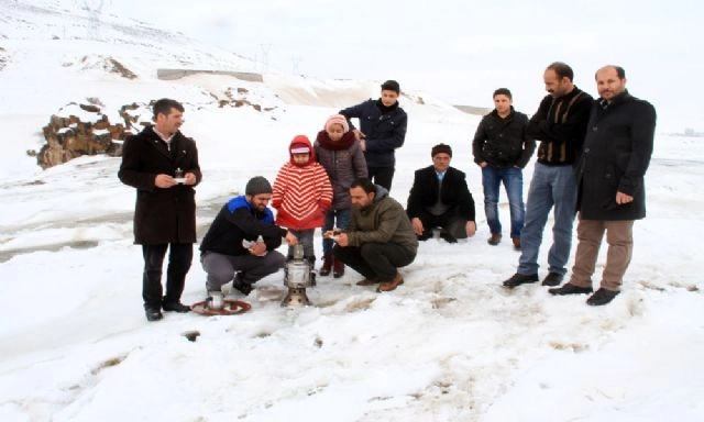 Van'ın Muradiye ilçesinde tamamen donan Bendimahi Çayı üzerinde kayak yapan vatandaşlar, semaver çayı içerek ısındılar.