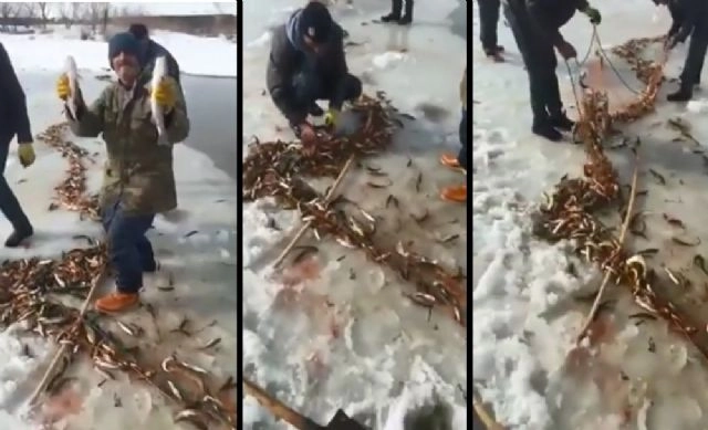Ağrı'nın Tutak ilçesine bağlı bir köyde buz tutan derede oltalarla onlarca kilo balık avlayan köylülerin sevinci kameraya yansıdı.