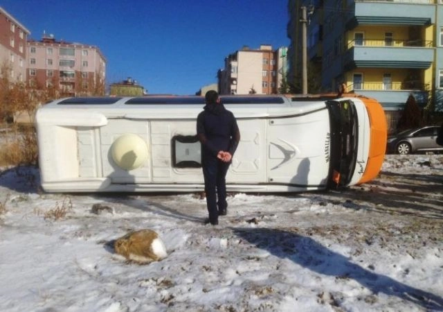 Ankara'nın Polatlı ilçesinde kar yağışı nedeniyle buz pistine dönen yolda virajı alamayan özel halk minibüsü yoldan çıkarak devrildi, kazada yaralanan olmadı.