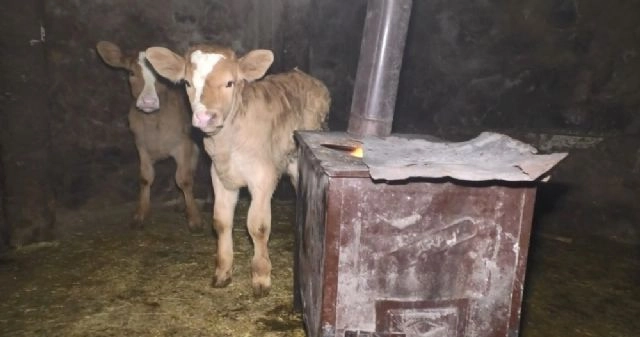 Ağrı'nın Taşlıçay ilçesinde bir vatandaş, üşüyen buzağılar için ahıra soba kurdu.