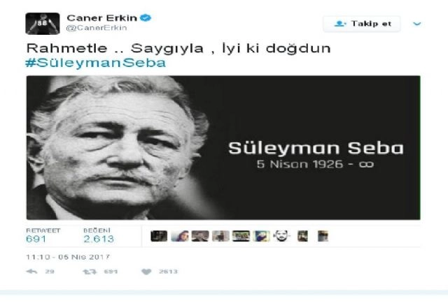Beşiktaş'ın tecrübeli oyuncusu Caner Erkin, Süleyman Seba'nın doğum gününü unutmadı. Beşiktaş'ın sezon başında Inter'den kiralık olarak kadrosuna kattığı Caner Erkin, siyah-beyazlı takımın efsane başkanı Süleyman Seba'nın doğum gününü sosyal medyadan yaptığı paylaşımla kutladı. Caner Erkin, mesajında Süleyman Seba'nın fotoğrafını paylaşarak, "Rahmetle... Saygıyla... İyi ki doğdun" ifadelerine yer verdi.