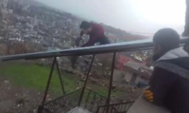 Şırnak'ın Cizre ilçesinde 3 katlı bir binanın çatısında güvenlik önlemi olmadan çalışan işçi, yürekleri ağza getirdi.