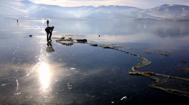 Doğu Anadolu Bölgesi'nin ikinci büyük gölü olan Ardahan'daki Çıldır Gölü, soğuk havayla birlikte buz tuttu.Hava sıcaklığının sıfırın altında 20 dereceye kadar düştüğü Çıldır Gölü'nün yüzeyi 6 santimetre buzla kaplandı. Üzeri cam gibi olan gölün kaygan zemini çocuklara hem zorlu hem de keyifli anlar yaşattı. Masmavi gökyüzü, karlı dağlar ve gökyüzünün mavimsi rengini yansıtan buzlu göl, tadına doyulmayan manzaralar oluşturdu.Çocuklar yüzeyi tamamen buzla kaplanan Çıldır Gölü üzerinde oyun oynayıp kayarken, balıkçılar da ilk ağlarını buzla kaplı yüzeyi delerek atmaya başladı.(Ahmet Rıfat Vural/İHA)