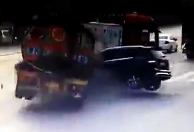 Çin'de ışık ihlali kazayla bitti.Hızla yola çıkan bir cip, akaryakıt tankerine çarptı. Kazada sürücüler hafif şekilde yaralanırken, tankerde büyük çaplı hasra oluştu. Tek teselli ise, tankerin boş olmasıydı.