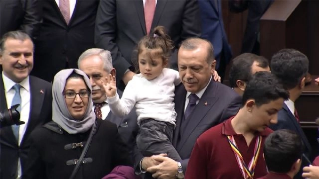 Cumhurbaşkanı ve AK Parti genel Başkanı Recep Tayyip Erdoğan, partisinin grup toplantısında konuştuğu sırada gülümseten bir olay yaşandı. Erdoğan'ı takip edenler arasında yer alan küçük bir kız çocuğu, Cumhurbaşkanı Erdoğan'a seslendi. "Tayyip Dede" diye bağıran çocuğu duyunca konuşmasını kesen Erdoğan da bu küçük hayranına "Efendim" diye cevap verdi.Toplantının bitimindeyse Cumhurbaşkanı, o sevimli çocukla bir araya geldi. Erdoğan, minik kıza bir de oyuncak hediye etti.