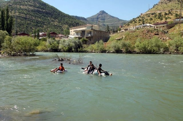 Şırnak'ın Beytüşşebap ilçesinde terör örgütü PKK'ya yönelik geniş kapsamlı operasyonun sürdüğü Kato Dağı eteklerinde bir grup çocuk, Habur Çayı'nın azgın sularına aldırış etmeden, pet şişe doldurdukları çuvallarla rafting yapıyor.