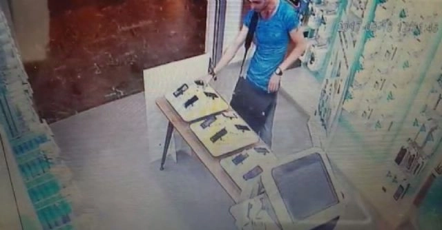 Denizli'de bir telefon bayisine giren hırsız, müşterilerin yoğun olduğu bir anda vitrinden telefonu alıp çantasına koydu. Hırsızın telefonu çalma görüntüleri saniye saniye kamera tarafından kaydedildi.