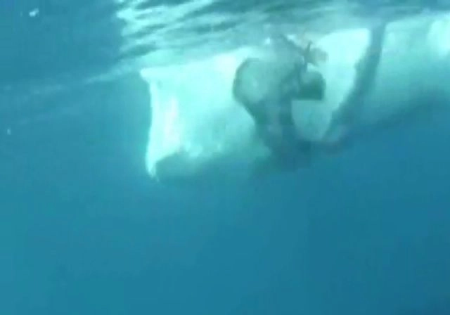 Dev balina dalgıcı böyle teğet geçti. Suya dalan iki dalgıç, balina sürpriziyle karşılaştı. Tonlarca ağırlığındaki balina, yüzeye çıkıp tekrar daldı. Bu sırada su altındaki yaşamı görüntülemeye çalışan adamı sıyırıp geçti. İki dalgıç büyük bir heyecan yaşarken, o anlar da kameraya böyle yansıdı.
