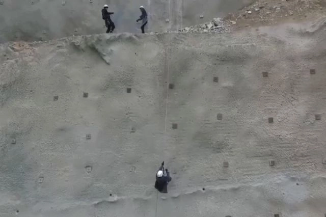 Artvin Yusufeli ilçesinde yapımı devam eden, temelden 270 metre yüksekliği ile tamamlandığında çift eğrilikli ince beton kemer kategorisinde dünyanın en yüksek 3. barajı olacak olan Yusufeli Barajı ve HES Projesi'nin inşatında profesyonel dağcılar işçilerin güvenliği için çalışıyor. Kayalık arazide gerilen teller üzerinde gezinen dağcılar, işçilerin güvenliği için görev alıyor. Düşme olasılığı olan kaya parçalarını önceden düşürerek olası tehlikeyi önlemeye çalışan dağcılar, sarp kayalık arazide taş düşmelerini önlemek için de bölgeyi çelik ağlarla kaplıyor.Tesisin kurulu gücü 558 MW olup, yıllık enerji üretiminin 1 888 GWh olması hedeflenen projede aynı zamanda, projenin tamamlanması ile yıllık yaklaşık 450 milyon TL milli bütçeye katkı sağlanması hedefleniyor. Yusufeli Barajı ve HES Projesinde % 62 fiziki gerçekleşme sağlanarak, çalışmalar hızla devam ediyor.(Hasan Fehmi Demir / İHA)