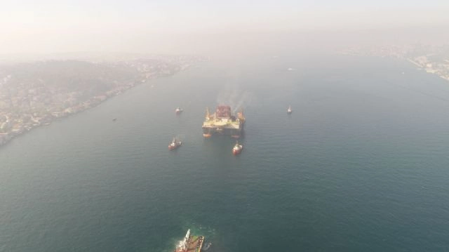 Bahama bayraklı, 'Scarabeo 9' adlı dev petrol arama platformunun İstanbul Boğazı'ndan geçişi havadan görüntülendi.