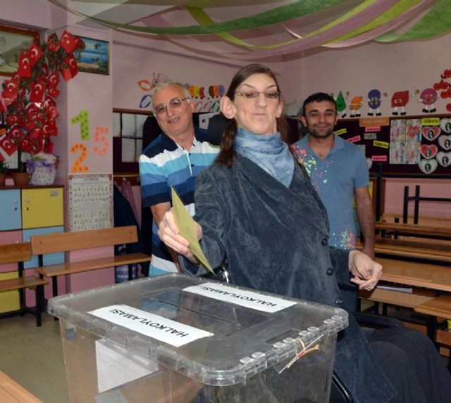 Karabük'ün Safranbolu ilçesinde, 2014 yılında 2 metre 13 santimetrelik boyuyla "dünyanın 18 yaş altı en uzun boylu genç kızı" olarak Guinness Rekorlar Kitabı'na giren weaver sendromu hastası Rümeysa Gelgi, ikinci oyunu kullanmanın sevincini yaşadı. Annesi Safiye ve babası Haydar Gelgi ile Safranbolu Altın Safran İlkokulu'na gelerek 1040 nolu sandıkta oyunu kullanan Gelgi, burada gazetecilere yaptığı açıklamada, ikinci kez oy kullandığını söyledi. Vatandaşlık görevini yerine getirdiğini söyleyen Rümeysa Gelgi, "Daha önce üst katlara yazdıklarında oyumu kullanamamıştım. Şimdi YSK sağ olsun alt kata yazınca rahat bir şekilde oyumu gelip, oyumu kullandım" dedi.Safranbolu Belediye Başkanı Dr. Necdet Aksoy da Gelgi'yi oy kullandığı için tebrik etti.(Çetin Uzunkara / İHA)