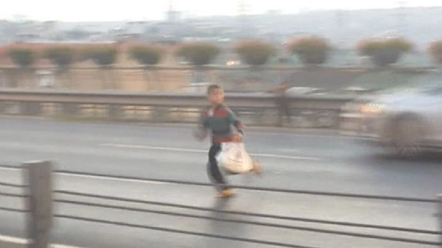 İstanbul'da, E-5 Karayolu üzerinde mendil satan çocukların, süratle seyreden araçların arasında karşıdan karşıya geçerek, adeta ölümle dans ettiği anlar kameraya yansıdı. İstanbul'da, eski ismiyle E-5 Karayolu üzerinde geçtiğimiz Cuma akşamı kaydedilen görüntüler trafikte su, kağıt mendil ve benzeri ürünleri satan çocukların yaşadığı tehlikeyi bir kez daha gözler önüne serdi. Akşam saatlerinde metrobüs hattının Darülaceze durağında bulunan ve mendil sattıkları görülen üç çocuk, defalarca ölümle burun buruna geldi. Adeta 'ölümle dans' eden çocukların dehşete düşüren hareketleri cep telefonu kamerasına da saniye saniye yansıdı. Kameraya yansıyan görüntülerde, bir çocuğun metrobüs tarafından karşıya geçmek için yola atlamasıyla başlıyor. Çocuk yola atladığında bütün şeritlerden araçların son derece hızlı geçtiği izlenirken, o çocuk ölümü neredeyse saliselerle sıyırıyor. Sürücülerin yaşadığı şaşkınlık ve dehşet, uzun korna seslerinden anlaşılırken, kazaya davetiye çıkaran çocuğun rahat tavırları dikkat çekiyor. Elinde beyaz bir poşet bulunan ve yaşça daha küçük olduğu görülen başka bir çocuğun karşıdan karşıya geçtiği anlarda da araçların süratle geçiş yaptığı ve o çocuğun da ölümü saliselerle atlattığı görülüyor.KENDİLERİNİ GÖRÜNTÜLEYEN MUHABİRİ TAŞ YAĞMURUNA TUTTULARÖlümle adeta dans eden çocukların sahne olduğu dehşet anları, kendilerini cep telefonu ile görüntüleyen kişiyi fark etmeleriyle başka bir boyut kazanıyor. Kendi canlarını hiçe sayan çocuklar, trafik güvenliğini bir kez daha tehlikeye düşürerek, yerden topladığı taşları E-5'ten süratle geçen araçların arasından görüntülerin çekildiği metrobüs durağına doğru fırlatmaya başlıyor. Dakikalar süren taş yağmuru ve ölümle dans anları, çocukların yoldan geri çekilmesi üzerine son buluyor.(Hüseyin Coşkun / İHA)