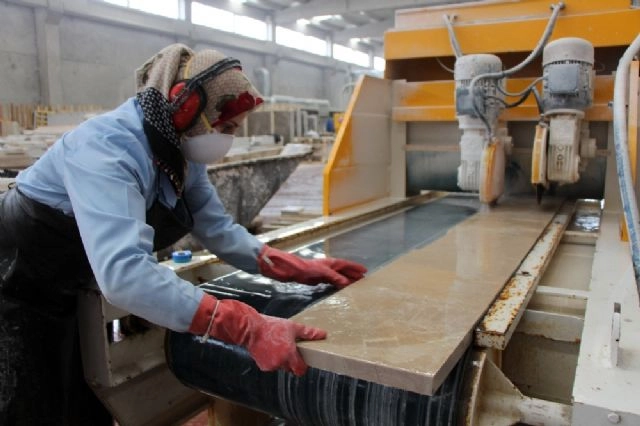 Amasya'da bir mermer fabrikasında 7 ay önce işe başlayan 10 kadın, iş makinelerinde mermer kesip ekmeğini taştan çıkartıyor.