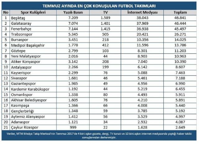 Medya Takip Merkezi'nin (MTM), Türkiye Spor Yazarları Derneği için hazırladığı temmuz ayı medya raporu açıklandı. Rapora göre, en çok konuşulan takım Beşiktaş olurken, teknik direktör listesinde Fatih Terim, kulüp yöneticilerinde Fikret Orman, futbolcular listesinde ise Pepe zirvede yer aldılar. Medya Takip Merkezi'nin temmuz ayı spor raporu açıklandı. Hareketli bir ayı geride bırakan spor camiasında yaşanan gelişmeler yakından takip edilirken, gündemi belirleyen başlıklar ele alındı. Türkiye Futbol Federasyonu (TFF) yaptığı açıklamada Spor Toto Süper Lig'in 2017-2018 sezonu Ağustos ayında başlayacak. Diğer yandan futbolcuların transfer dönemi hızla devam ederken, Fatih Terim'den sonra yerine gelecek milli takım teknik direktörlüğü için Mustafa Denizli, Şenol Güneş, Mircea Lucescu, ve Rıdvan Dilmen konuşulan isimler arasında yer aldı. Medya Takip Merkezi'nin, Temmuz ayı futbol takımları sıralamasında Beşiktaş 46 bin 841 haberle listenin zirvesinde yer alırken, Galatasaray 46 bin 444 haberle listenin ikinci sırasına yerleşti. Fenerbahçe 45 bin 497 haberle üçüncü, Trabzonspor 26 bin 271 haberle dördüncü sırada yer aldılar. Bursaspor ise 14 bin 25 haberle beşinci sırada bulunuyor.TEMMUZ AYININ ZİRVE İSMİ FİKRET ORMANMTM, Temmuz ayında öne çıkan kulüp yöneticilerini de belirledi. Rapora göre, Beşiktaş Kulübü Başkanı Fikret Orman 8 bin 63 haberle listenin zirvesinde yer alırken, Trabzonspor Başkanı Muharrem Usta 7 bin 201 haberle listenin ikinci sırasında bulunuyor. Galatasaray Başkanı Dursun Özbek 57 bin 199 haberle üçüncü, Fenerbahçe Başkanı Aziz Yıldırım 3 bin 953 haberle dördüncü sırada yer aldılar. Listenin beşinci sırasında 3 bin 509 habere konu olan Kulüpler Birliği Başkanı Göksel Gümüşdağ ise yeni dönemde Kulüpler Birliği Vakfı Başkanlığı'na aday olmayacağını açıkladı.FATİH TERİM'İN GÖREVDEN ALINMASI GÜNDEMİ BELİRLEDİTürkiye Futbol Direktörü Fatih Terim'in görevinden alınması spor dünyasının gündemine otururken Terim, kişisel Twitter hesabından yaptığı açıklamada istifa etmediğini, görevine TFF'nin son verdiğini kamuoyuna açıkladı. Terim'in görevinden ayrılmasının yanında, alacağı işsizlik maaşın hayli yüksek olması da medyanın gündeminde yer alan başlıklar arasında oldu. Fatih Terim, 15 bin 121 haberle listenin zirvesinde yer aldı. Listenin ikinci sırasında Beşiktaş Teknik Direktörü Şenol Güneş, 12 bin 450 habere konu oldu. Şenol Güneş, milli takıma geçeceğine yönelik iddialara "Beşiktaş'tayım ve burada mutluyum. Buraya ait biriyim" sözleriyle açıklık getirdi. Galatasaray Teknik Direktörü Igor Tudor 11 bin 515 haberle listenin üçüncü, Fenerbahçe Teknik Direktörü Aykut Kocaman 11 bin 321 haberle dördüncü, Evkur Yeni Malatyaspor'un Teknik Direktörü Ertuğrul Sağlam 4 bin 761 haberle beşinci sırada yer buldular.BEŞİKTAŞLI YILDIZ PEPE LİSTENİN ZİRVESİNDEReal Madrid ile sözleşmesi sona erdikten sonra Beşiktaş'a transfer olan Portekizli futbolcu Pepe 10 bin 230 haberle en çok konuşulan futbolcular sıralamasında ilk sırada yer aldı. Transfer haberleriyle konuşulan Sneijder, 9 bin 807 haberle ikinci sırada yer alırken Mathieu Valbuena 5 bin 924 haberle listenin üçüncü sırasına yerleşti. Listenin dördüncü sırasında Arda Turan 5 bin 845 haberle yer alırken, Beşiktaş'tan ayrılacağına yönelik iddialarla gündeme gelen Ricardo Quaresma, yaptığı açıklamada ayrılığı düşünmediğini belirterek 4 bin 996 haberle beşinci sıraya yerleşti.
