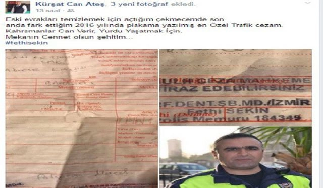 Ülkü Ocakları Eğitim ve Kültür Vakfı Balıkesir İl Başkanı Kürşat Can Ateş, sosyal medya hesabından, İzmir Adliyesi önünde düzenlenen terör saldırısında şehit düşen Fethi Sekin'in yazdığı trafik cezasını 'En özel trafik cezam' şeklinde paylaştı.